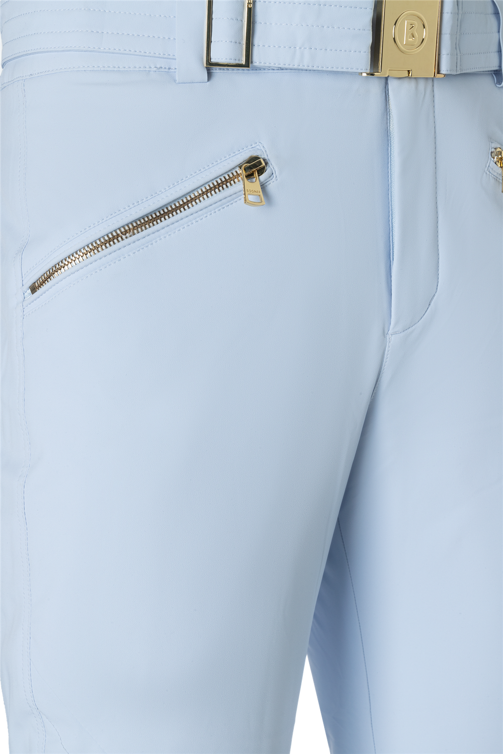 The Franzi ski trousers in water-resistant 4-way stretch with warming Comfortemp® filling and internal snow guard are a performance-driven item. The design is accentuated by the belt with metal buckle, zip pockets and stitched knee sections, complemented by stylish logo details. The padded lumbar protection ensures a comfortable finish.