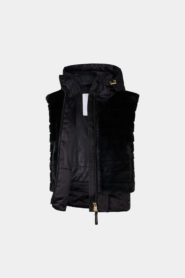 As a key piece for the piste look, the Yumi gilet features a design mix of faux fur and satin, complemented by iconic label details. The adjustable hood and inner waistband provide comfort and protection from the wet and snow. Goose down and feather padding provides a warming finish.