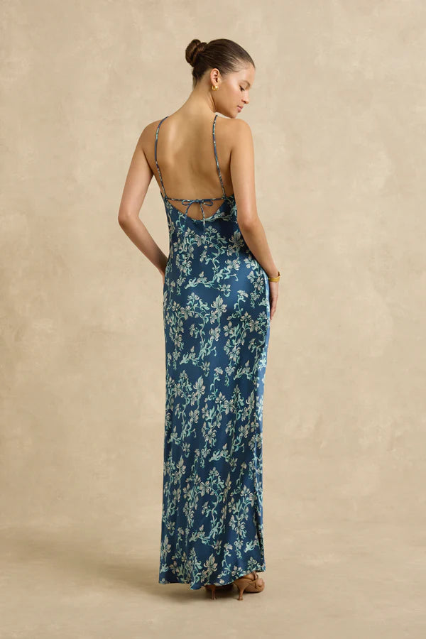 The Elisa Dress in Jasmine Blue is crafted from sandwashed silk sateen, with a bias cut that softly skims the figure. Printed with delicate floral vines, it features a halter neckline and a full-length silhouette. Fully lined in georgette for a smooth, elegant finish.