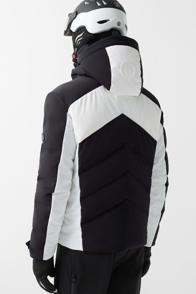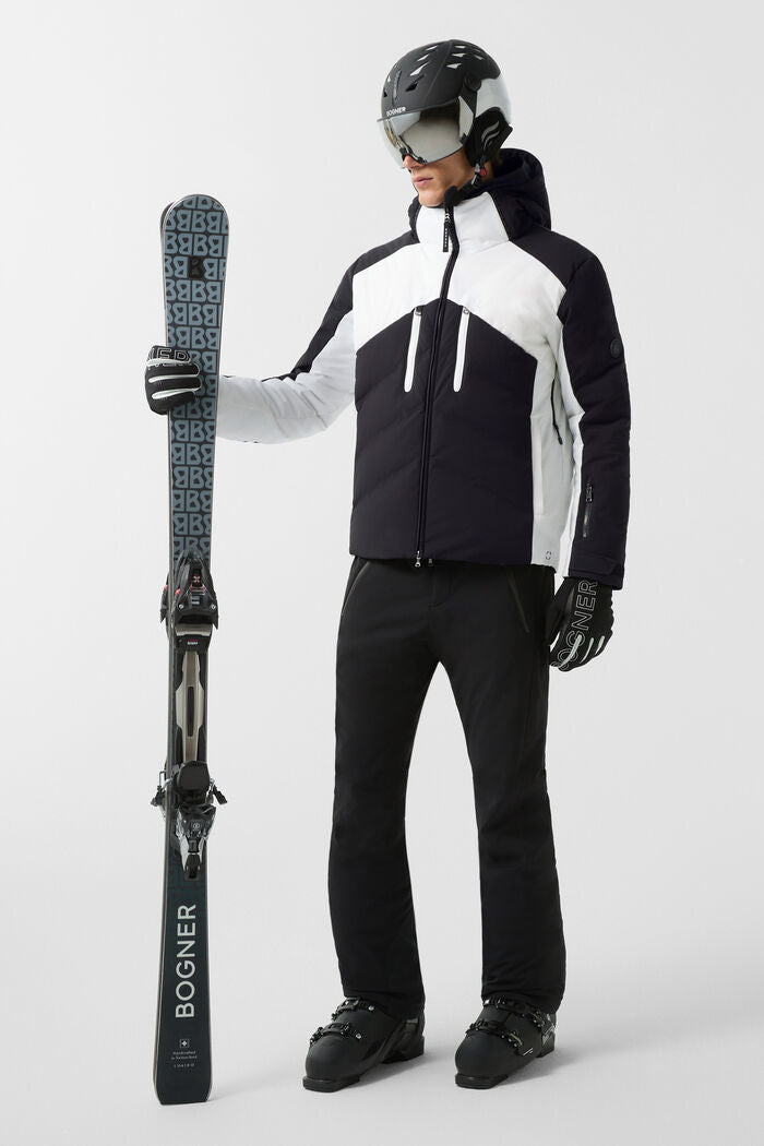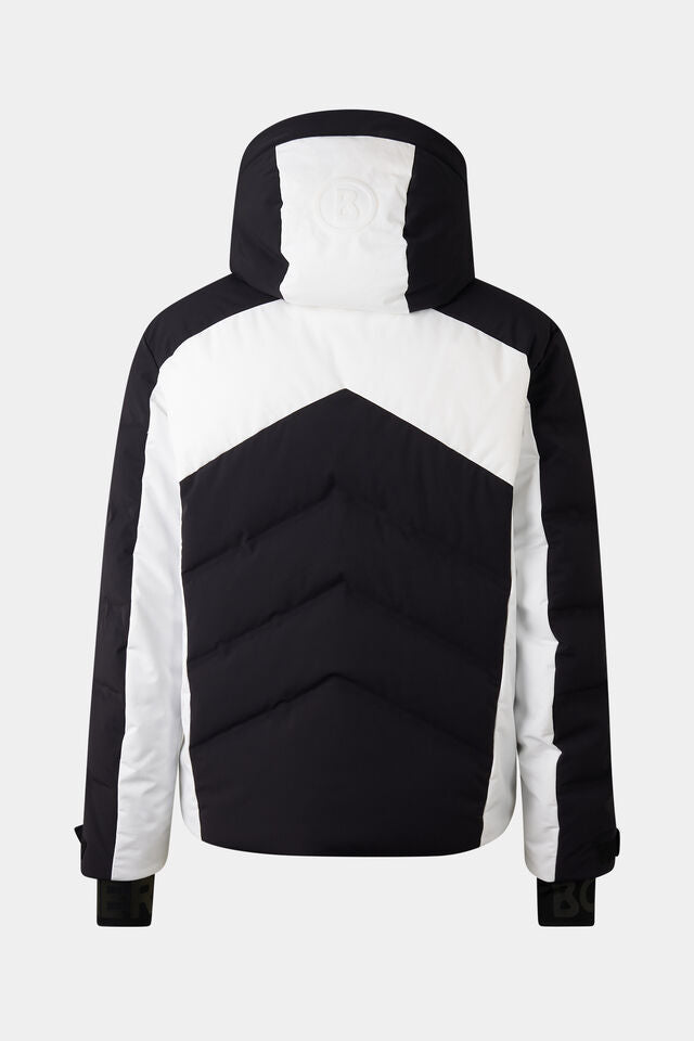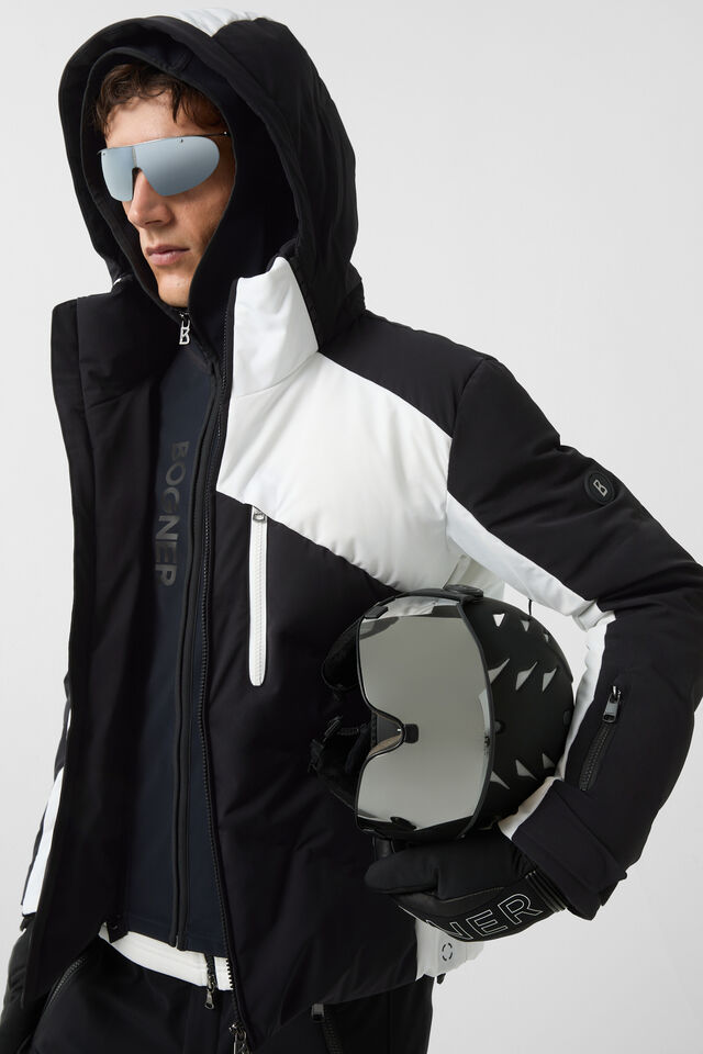 The Jervis down ski jacket is a functional piece with waterproof 4-way stretch and warm padding made from goose down and technical fibers. The zip-off softshell inlay, mesh inserts and hood with drawstring ensure comfort. The cohesive system at the hem rounds off the performance-driven item.