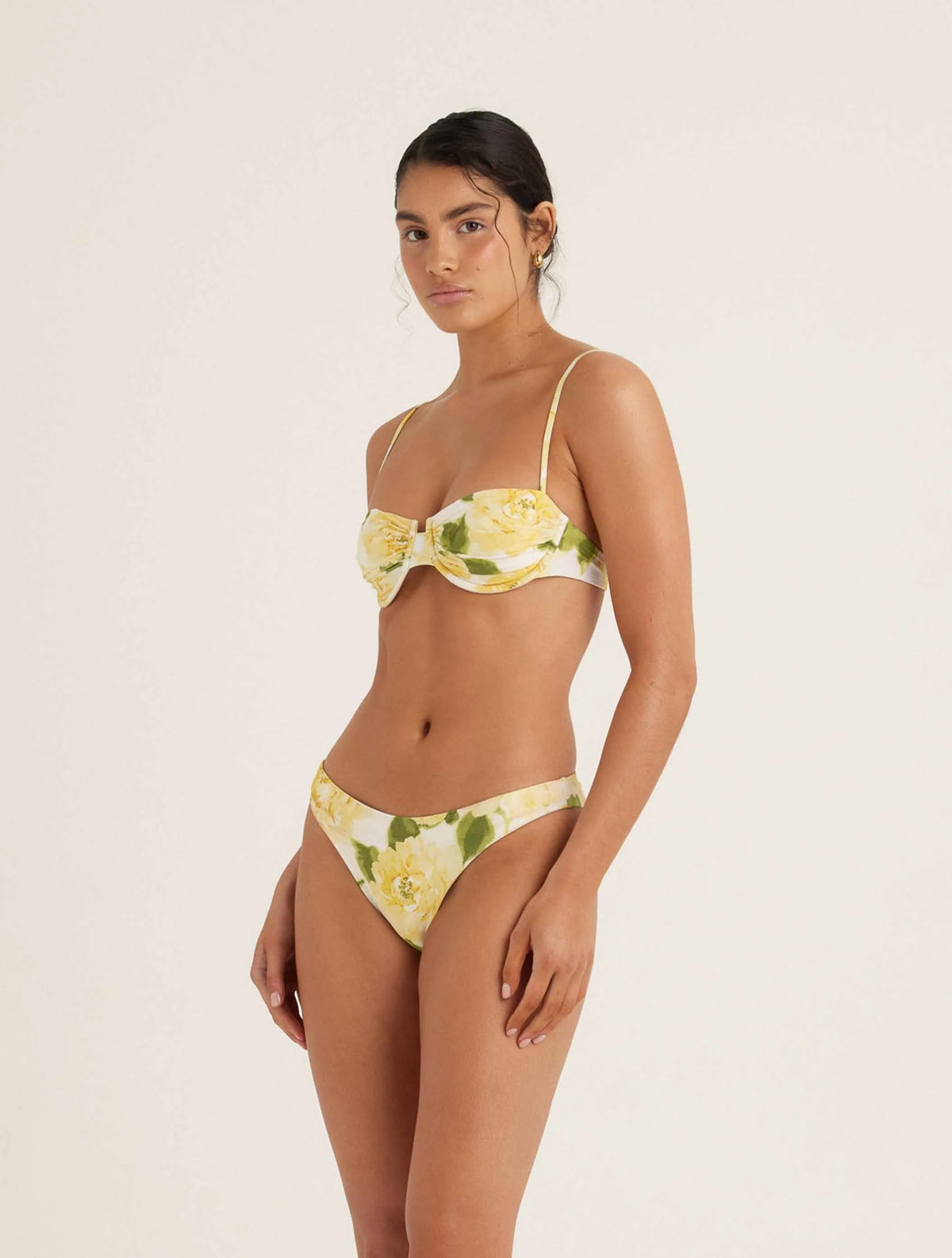 Introducing Peony's Staple Pant in Claire De Lune, a brief bikini swim bottom silhouette in Peony's exclusive print. Designed in a mid-rise silhouette sitting at the hips, elasticated for a fitted silhouette. Pair it with the Ruched Holiday Balconette for a coordinated set.